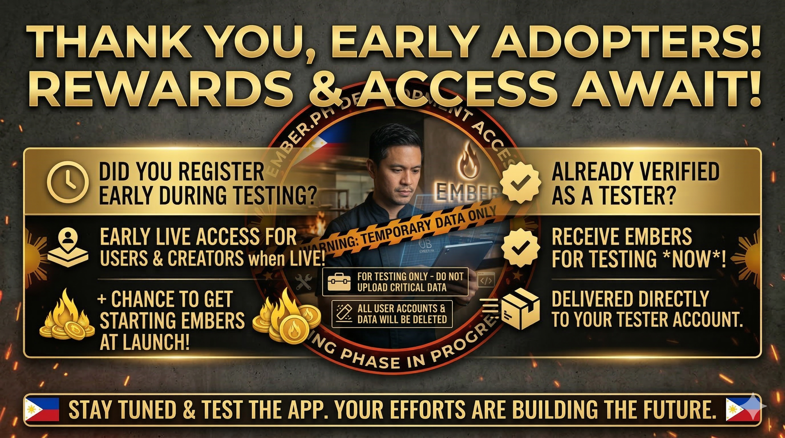 🚀 Welcome to the Ember.ph Testing Phase! Thank you for checking out Ember.ph! We are currently hard at work behind the scenes, and the current version of the platform is live for testing purposes only. As we fine-tune the experience and prepare for our official launch, please keep the following in mind: Temporary Accounts & Content: Any accounts you create, data you enter, or content you upload right now is strictly for testing the system. Complete Data Wipe: Once this testing phase concludes, all user accounts and uploaded data will be permanently deleted to ensure a clean slate for the real launch. Re-registration Required: When Ember.ph officially goes live, everyone will need to register for a brand new account. We appreciate your early interest and patience as we build out the platform. Stay tuned for updates on our official release date!